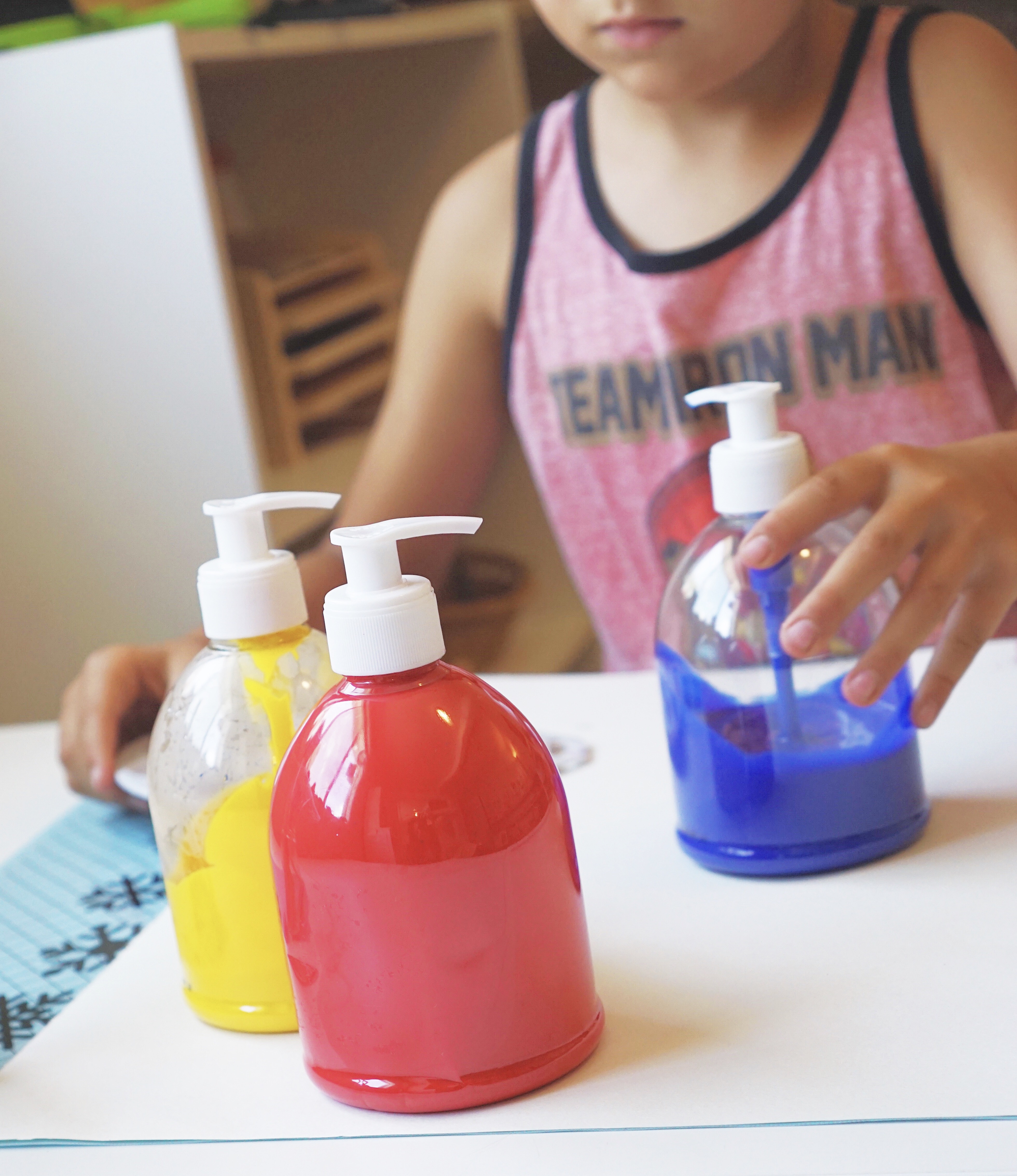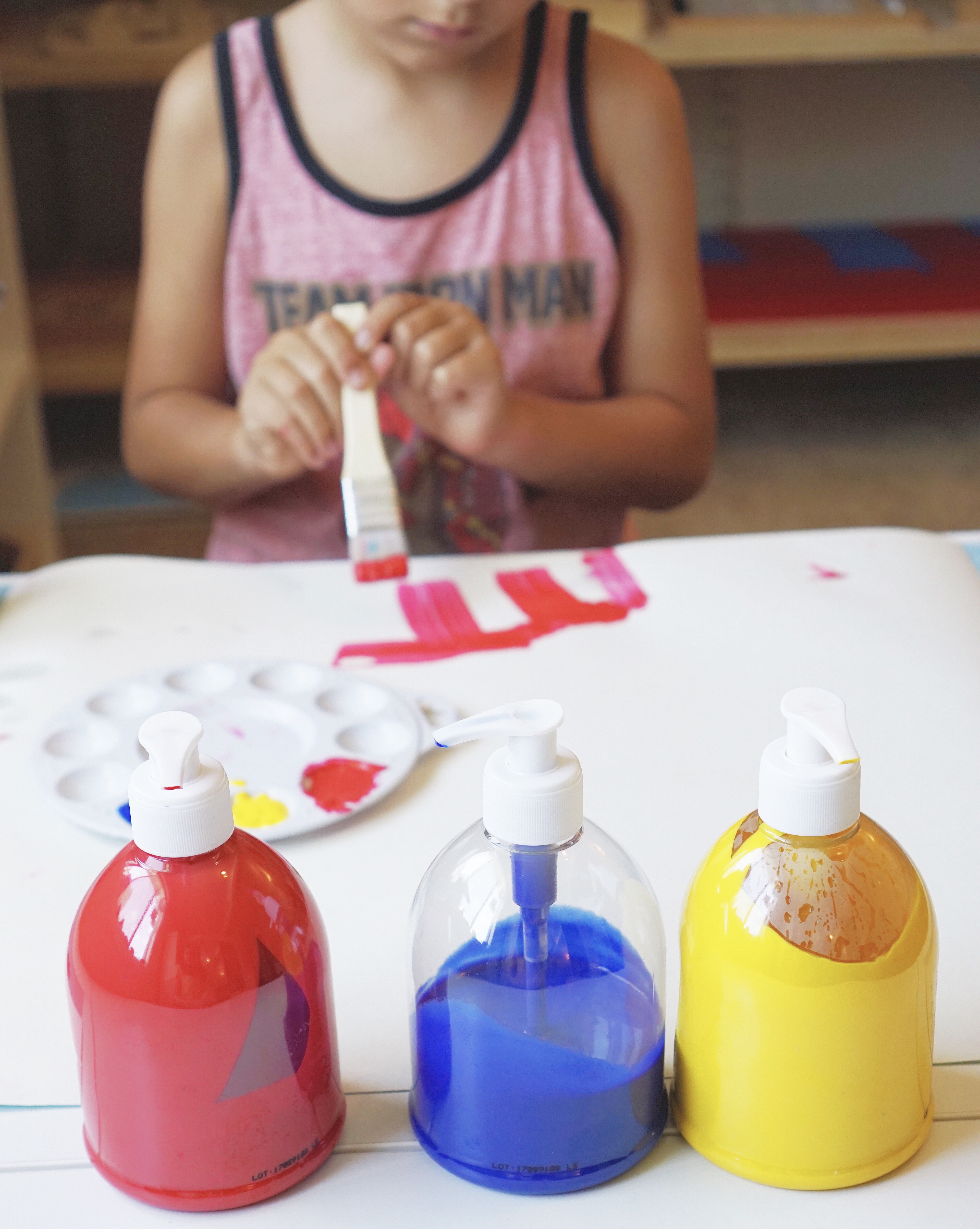 Organización: Para esto necesitas 3 botellas de plástico recicladas, específicamente botellas de jabón de manos con bombita. ¡Si, asi de facil es la cosa! Guarda botellas de jabón de manos con bomba y utilizalas para poner un poco de pintura en ellas. Los peques en vez de vaciar pintura a chorros, o esperar a que tu lo hagas, lo pueden hacer bombeando la jabonera un par de veces ellos mismos. De esta manera se controla la cantidad, facilita el uso de la pintura, y la experiencia se convierte en una actividad completamente autónoma.