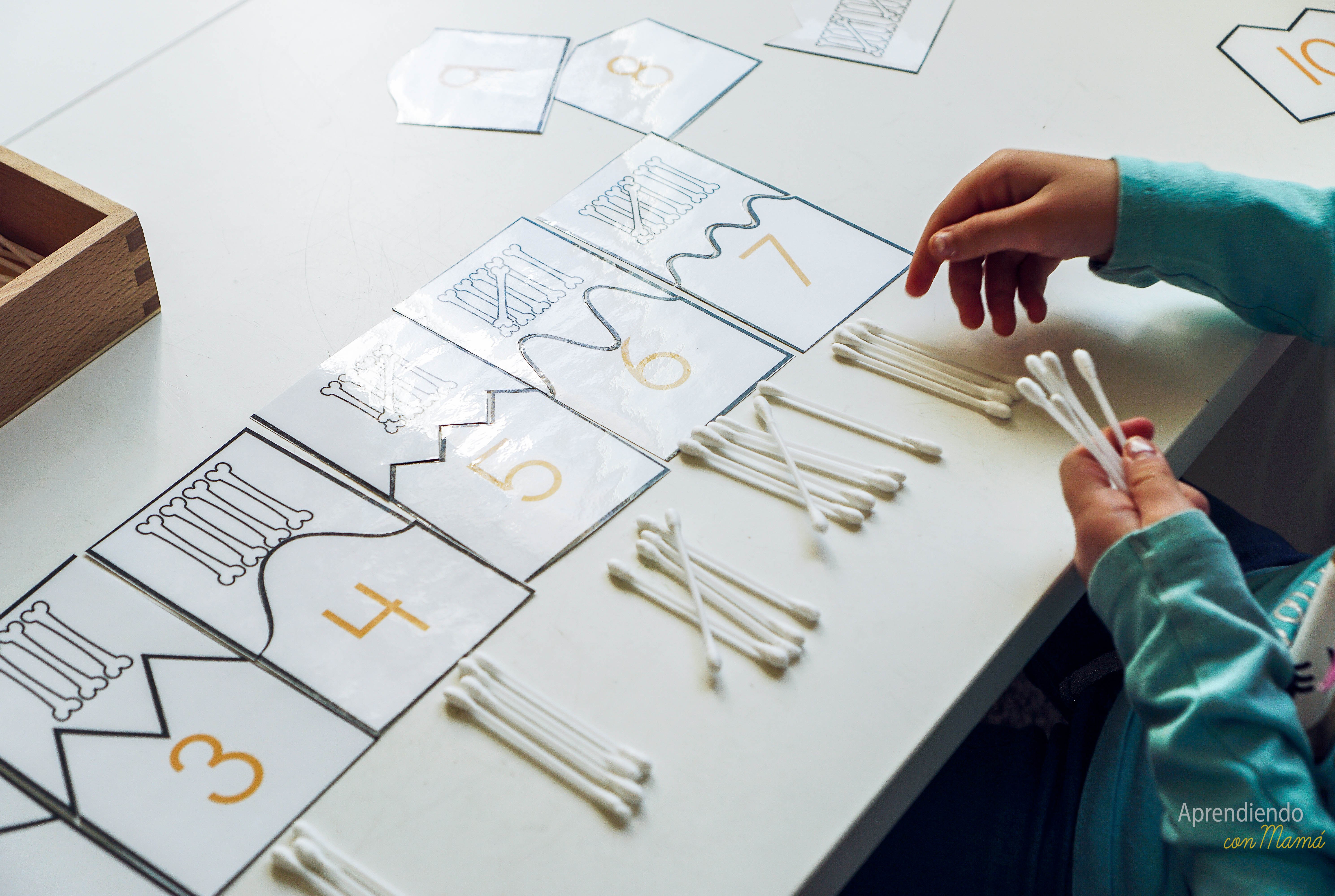 Montessori en Casa tema esqueletos para preescolares. Matemáticas con tema de esqueleto, tarjetas de conteo gratuitas con uso de q-tips.