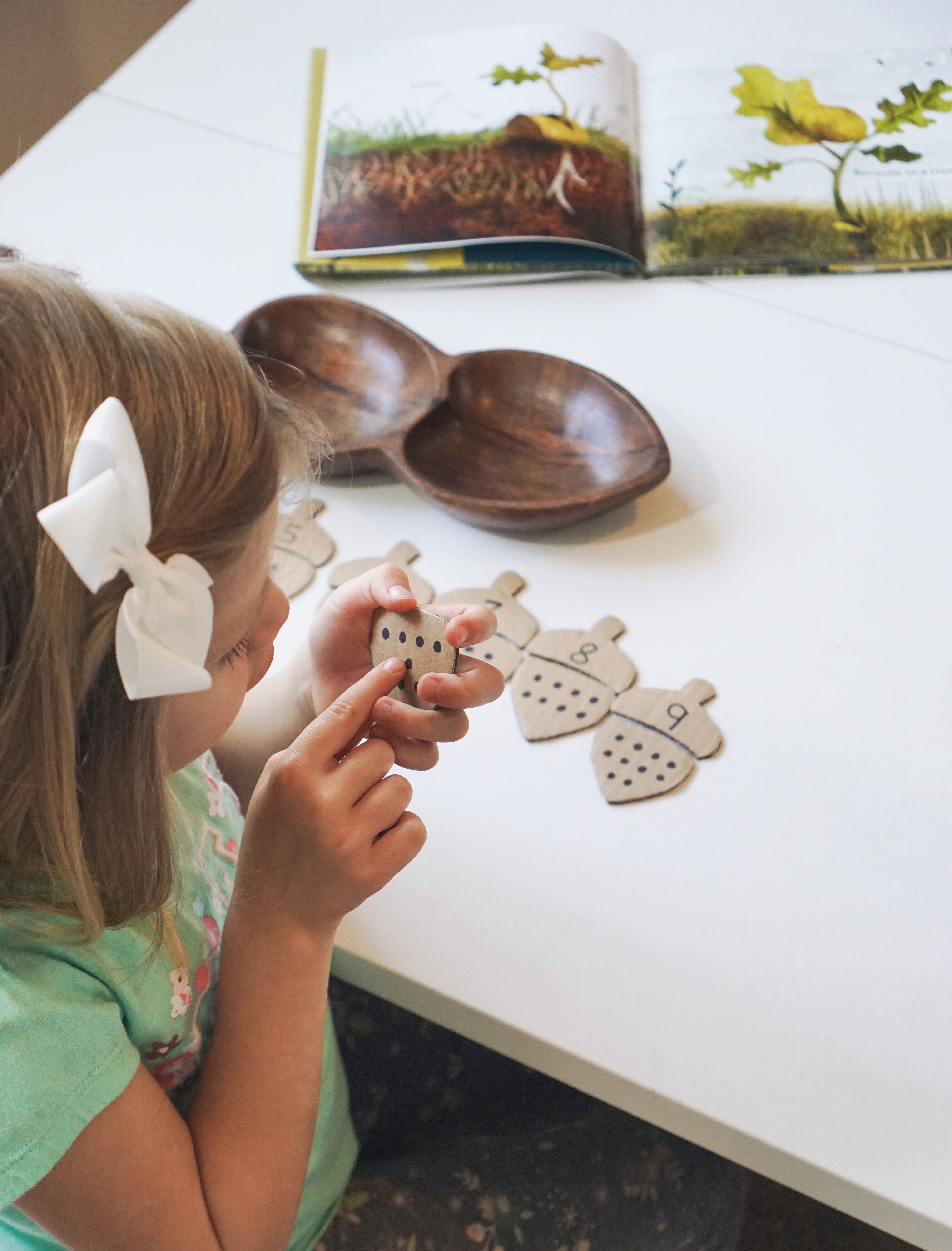 Ya cortadas las bellotas en cartón, con un marcador, escribe el número (símbolo) en la parte superior de la bellota, y en la parte de abajo marca la cantidad del numero correspondiente con puntitos. Una vez escrito el número y la cantidad de números 1 al 10, recorta la cúpula (parte superior) de la bellota para obtener dos partes separadas, una de la cúpula con el número, y la otra de la nuez con la cantidad. Esta actividad además de ser muy entretenida ayuda a los peques con la relación de numero-cantidad, orden de números, y también desarrolla la capacidad lógica y la concentración.